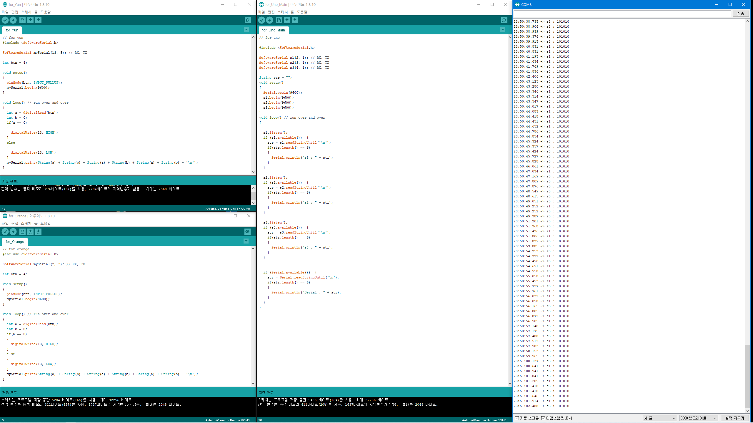 - 최종 yun보드 3개의 아날로그 신호선 6개를 각각 총 18개를 uno에게 보내 uno가 신호를 종합하는 소스 구현