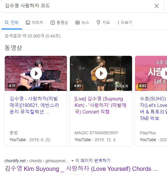 역시 초보자답게 영상을 여기저기 찾아다니면서 기타가 잘 보이는 영상을 선택해서 재생과 정지를 반복하며 하나하나 구했습니다...